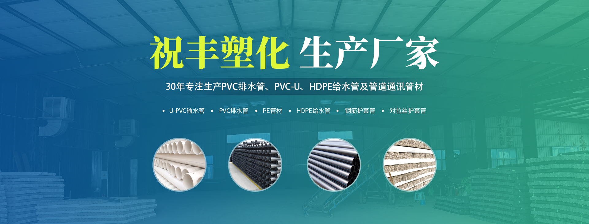 安陽市祝豐塑化有限公司坐落在滑縣工業(yè)園區(qū),東臨大廣高速,西臨京珠高速,是鄭州、鶴壁、安陽、濮陽四個城市的輸紐,交通便利、環(huán)境優(yōu)美。       公司始建于八十年代,經(jīng)過二十余年的艱辛創(chuàng)業(yè),規(guī)模不斷壯大,由十多萬元資產(chǎn)的小廠,發(fā)展到現(xiàn)占地面積達(dá)一萬多平,建筑面積一萬平,資產(chǎn)2000多萬元管材生產(chǎn)企業(yè)。公司生產(chǎn)PVC-U、PVC排水管、HDPE給水管、鋼筋護(hù)套管管道通訊管材等產(chǎn)品,廣泛用于農(nóng)田節(jié)水、高山引水、人畜用水、建筑、電力通訊等多種用途,品種齊全。為了滿足用戶需求,可承攬各種給水、節(jié)水、灌溉工程。“祝豐塑化”憑借強(qiáng)勁的實(shí)力,優(yōu)良的管理水平。“以質(zhì)量求生存,以信譽(yù)求發(fā)展”的原則全力以赴和大家共同塑造美好未來。..
